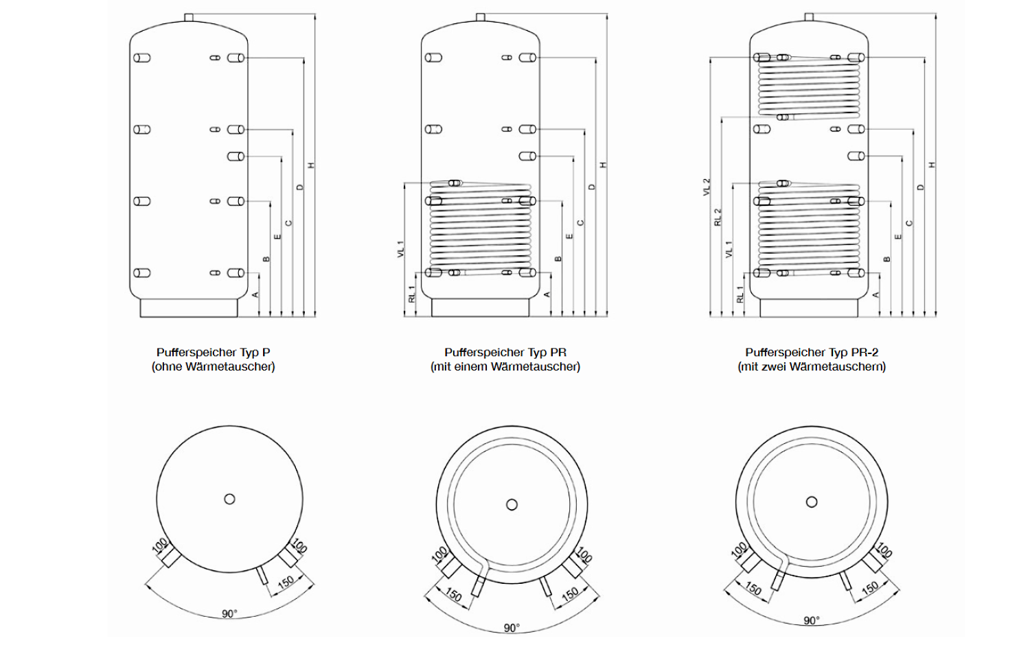 200 bis 1000 Liter - Typ P, PR, PR-2Abmessungen und technische Daten: